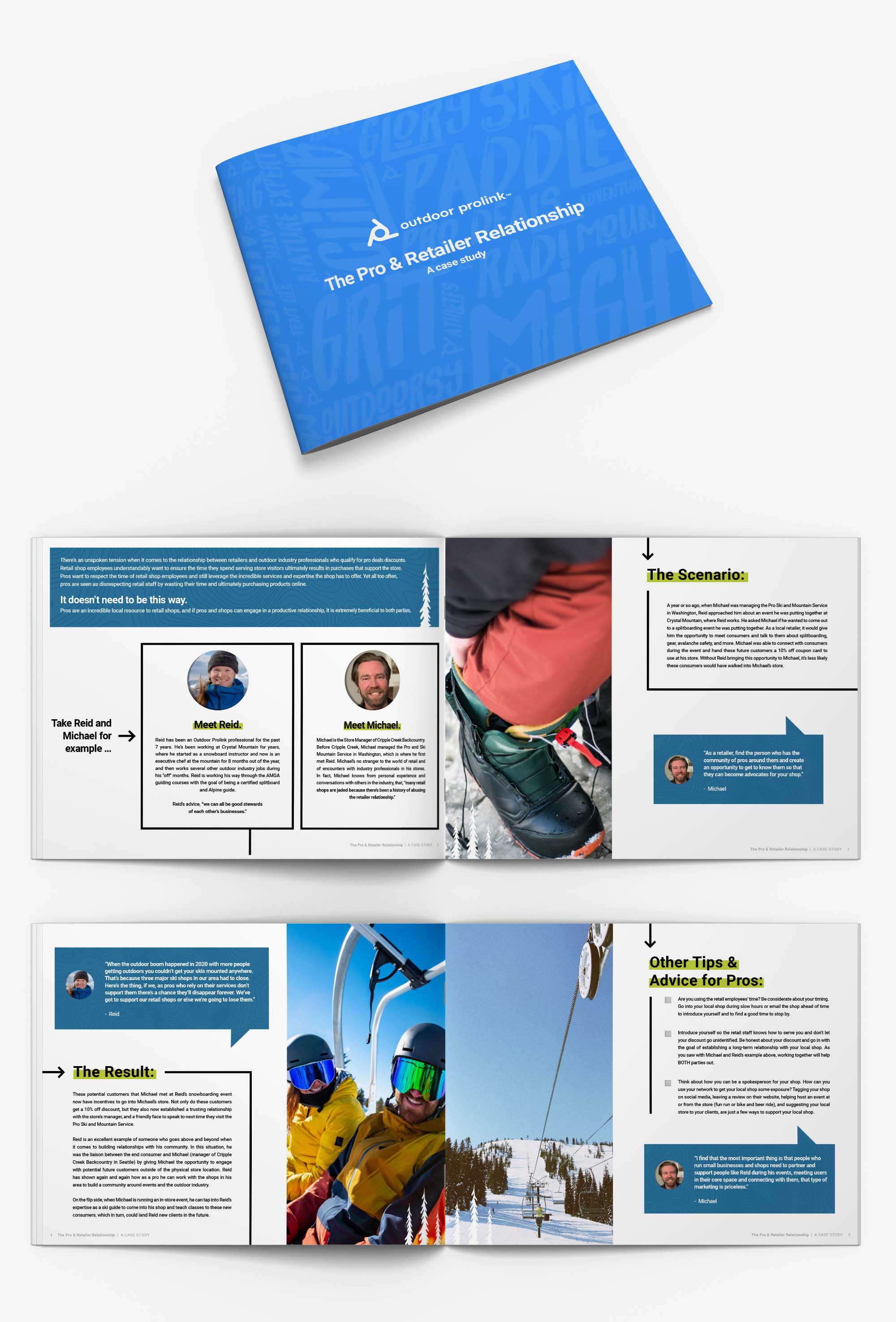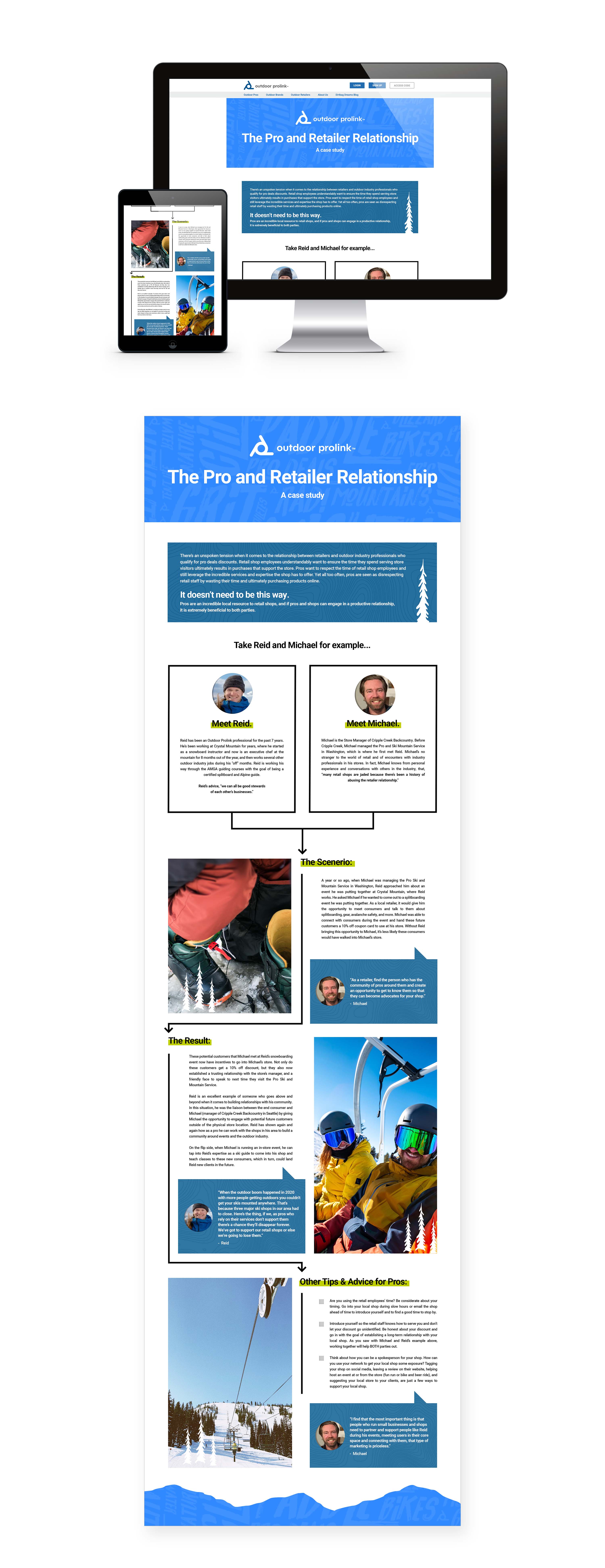 This particular project was a case study showing the relationship between retailers and outdoor industry professionals. Landing page and downloadable PDF design.