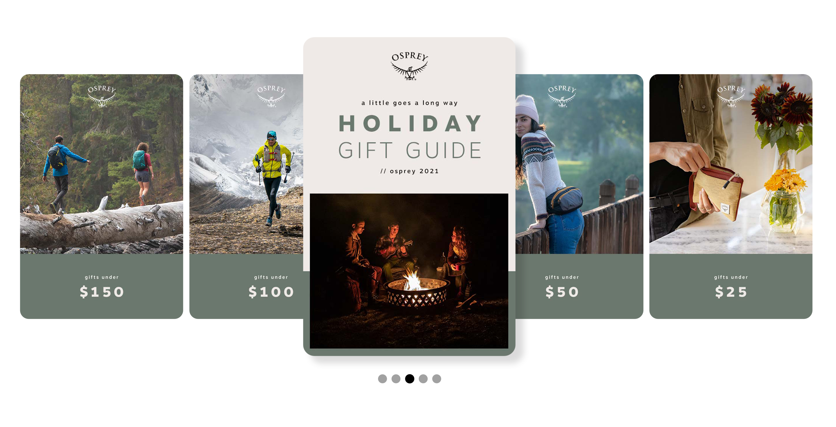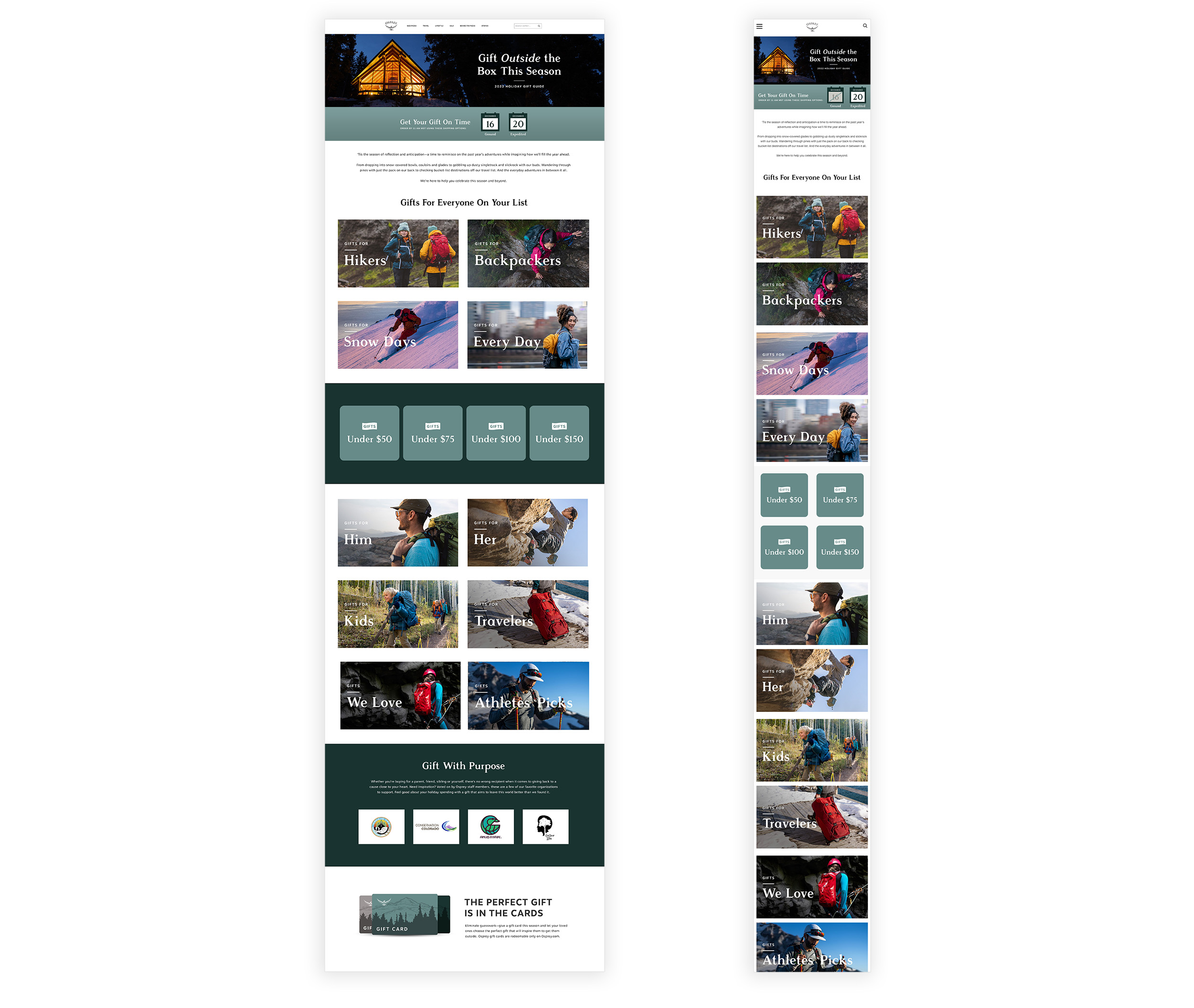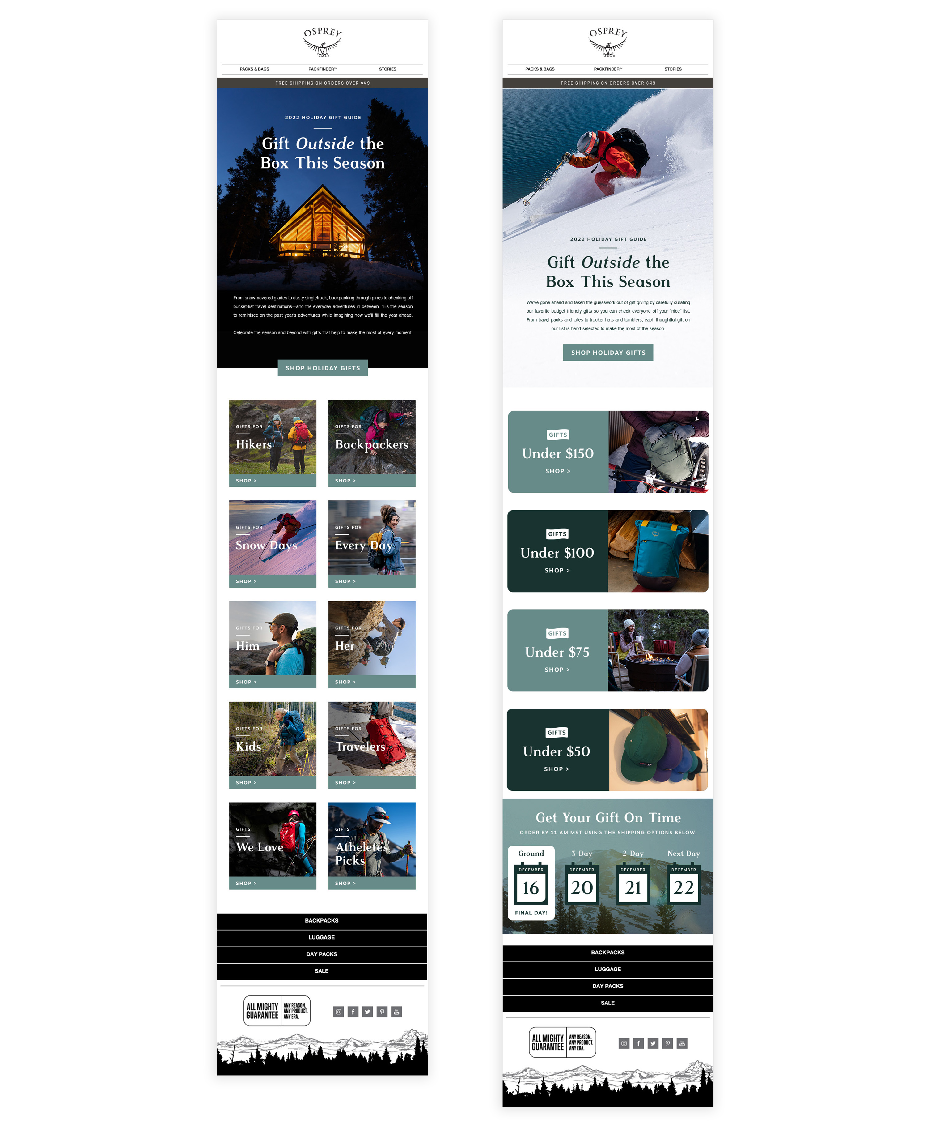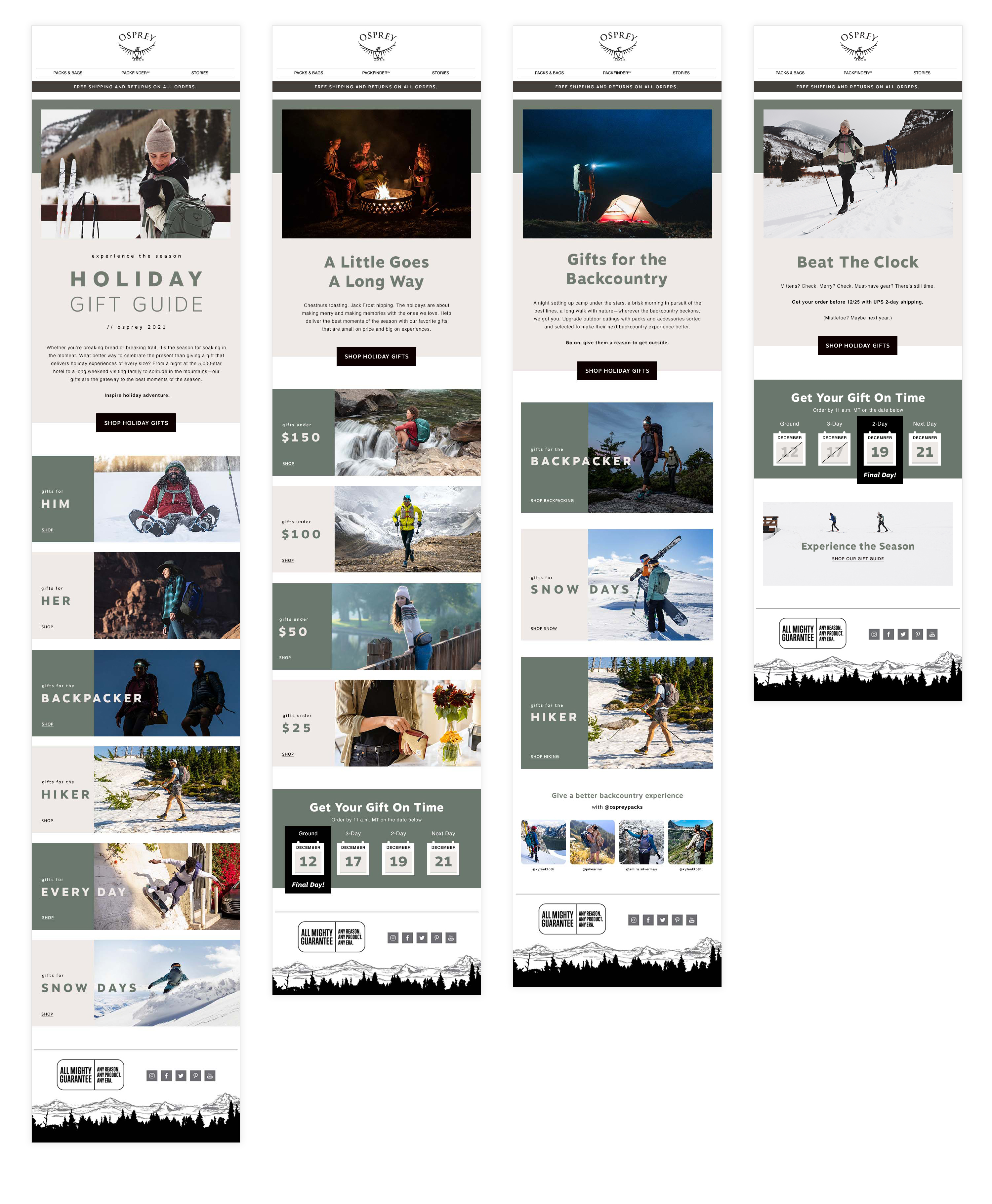 Osprey Packs Holiday Gift Guide's for the '22, '21 and '20 seasons. Copywriting: Beth Puliti